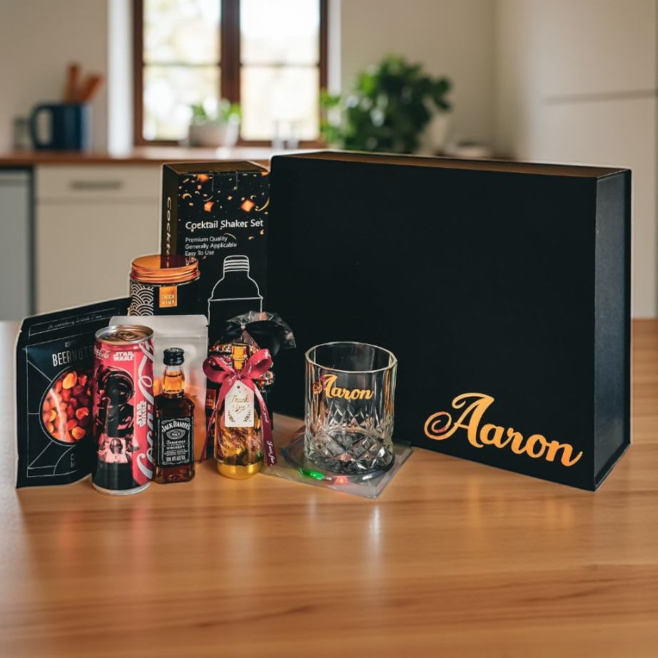 The Whiskey Cocktail Hamper is the ultimate gift for whiskey lovers, featuring Jack Daniel’s, premium mixers, personalised glassware, a cocktail shaker set, and gourmet treats. Perfect for birthdays, special celebrations, and corporate gifting, all beautifully packed in a custom gift box.