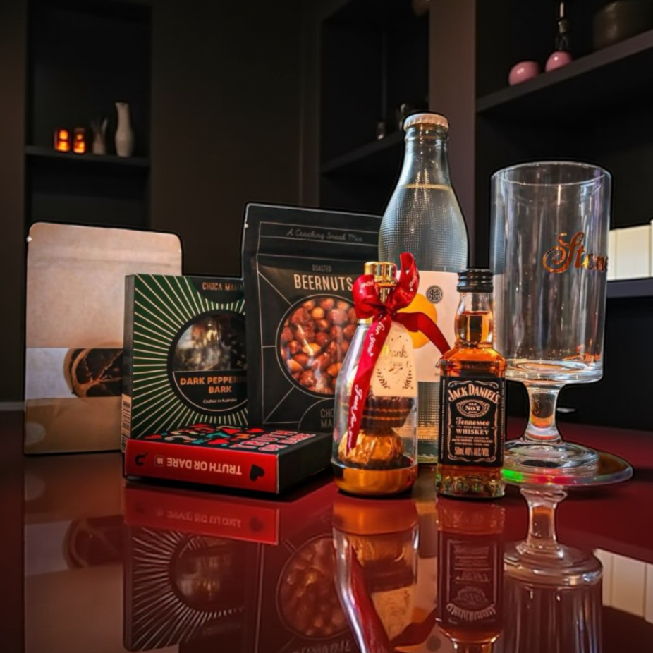 The Yuzu Jack Cocktail Hamper features Jack Daniel’s whiskey, refreshing Yuzu soda, gourmet chocolates, savoury snacks, and personalised glassware. Packed in a custom gift box, it’s the perfect cocktail gift hamper for birthdays, celebrations, and corporate gifting.